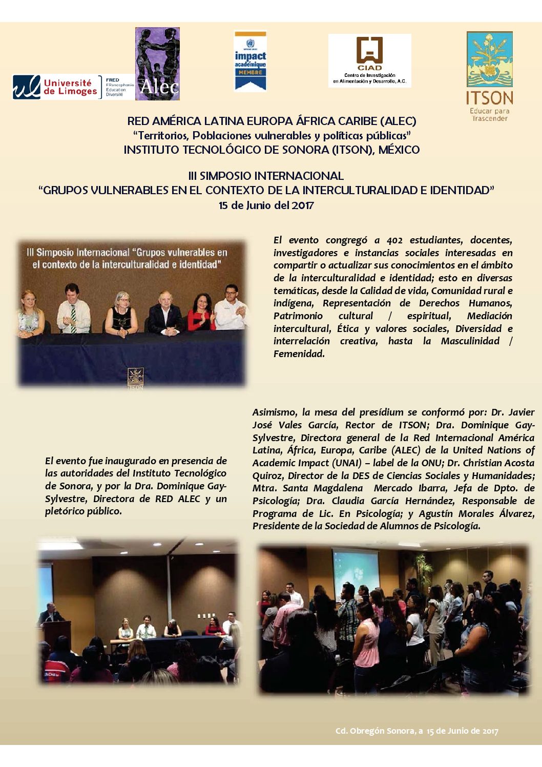 La RED América Latina África Europa Caribe (ALEC) “Territorios, Poblaciones Vulnerables y Políticas Públicas” (Limoges, Francia) y el Instituto Tecnológico de Sonora (ITSON-México), organizaron el Tercer Simposio Internacional sobre “Grupos vulnerables en el contexto de la interculturalidad e identidad”. Se trató de un intercambio de experiencias, cuyo eje temático primordial fue la aportación de los grupos vulnerables en su semejanza y diversidad. El evento tuvo como sede al ITSON, Unidad Obregón. El objetivo del simposio fue promover un espacio de reflexión sobre la condición de vulnerabilidad en el contexto de la interculturalidad e identidad con el fin de favorecer la conformación de estrategias que permitan mejorar sus condiciones de vida.
