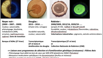 C’est dans ce cadre que nous nous sommes intéressés à la transition aubier-bois de cœur et à l’accumulation d’extractibles spécifiques qui selon les espèces peuvent être reliés à la coloration voire à la durabilité naturelle des bois. Au cours de cet exposé et sur la base de nos travaux successifs sur le noyer, le douglas et le robinier, je montrerai que (bien que complexe et difficile d’accès) la duraminisation représente selon les espèces considérées autant de modèles d’étude qui gagneraient à être mieux compris et maîtrisés (figure). Outre des aspects de valorisation industrielle (production d’extraits fluorescents et antimicrobiens), les travaux que nous avons menés chez le noyer, le douglas et le robinier par des approches complémentaires de physiologie, de biochimie, de biologie moléculaire ouvrent maintenant des perspectives intéressantes de phénotypage et de génotypage à haut débit. Le développement de ces technologies à haut débit pourrait notamment se baser sur les connaissances acquises sur les extractibles, les mécanismes physiologiques spécifiquement mis en jeu et finalement les gènes impliqués dans ces transitions de couleur et de durabilité.