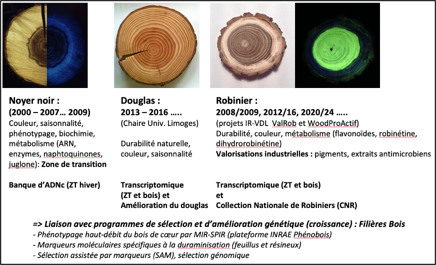 C’est dans ce cadre que nous nous sommes intéressés à la transition aubier-bois de cœur et à l’accumulation d’extractibles spécifiques qui selon les espèces peuvent être reliés à la coloration voire à la durabilité naturelle des bois. Au cours de cet exposé et sur la base de nos travaux successifs sur le noyer, le douglas et le robinier, je montrerai que (bien que complexe et difficile d’accès) la duraminisation représente selon les espèces considérées autant de modèles d’étude qui gagneraient à être mieux compris et maîtrisés (figure). Outre des aspects de valorisation industrielle (production d’extraits fluorescents et antimicrobiens), les travaux que nous avons menés chez le noyer, le douglas et le robinier par des approches complémentaires de physiologie, de biochimie, de biologie moléculaire ouvrent maintenant des perspectives intéressantes de phénotypage et de génotypage à haut débit. Le développement de ces technologies à haut débit pourrait notamment se baser sur les connaissances acquises sur les extractibles, les mécanismes physiologiques spécifiquement mis en jeu et finalement les gènes impliqués dans ces transitions de couleur et de durabilité.