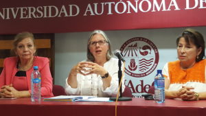 La Doctora Dominique Gay-Sylvestre impartiendo su conferencia. A la izquierda, la Doctora Esperanza Quintero Rodriguez, Subdirectora Académica de la Unidad Regional Los Mochis; a la derecha, la doctora Rosario Martinez Gil, Responsable del del Programa Institucional de Igualdad y Perspectiva de Género.