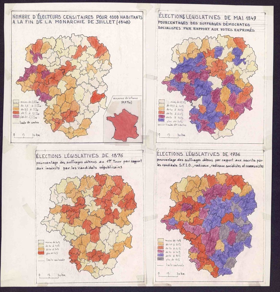 Nombre d'électeurs censitaires pour 1000 habitants à la fin de la monarchie de Juillet (1848) / Elections législatives de mai 1849 / Elections législatives de 1876 / Elections législatives de 1936. Atlas de Bautier (BFM)