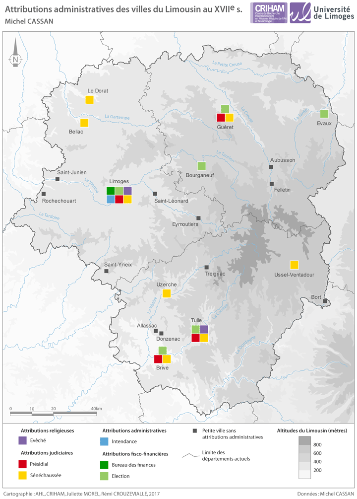 Au siècle suivant, la création des présidiaux sous Richelieu et le chancelier Séguier engendra moins de tensions tant il était devenu évident que seules les villes les plus peuplées pouvaient accueillir ces tribunaux : Guéret dans la Marche en 1635, Tulle dans le Bas-Limousin en 1637 furent choisies. Avec Brive et Limoges pourvues de ce rang depuis 1551/1553, elles firent partie de la soixantaine des villes présidiales du royaume. La carte judiciaire resta inchangée jusqu’à la Révolution, ainsi que la carte de l’Eglise avec Limoges et Tulle comme cités épiscopales de la province. Limoges, siège de l’intendance du Limousin à partir de la fin du XVIIe siècle cumulait le plus grand nombre d’attributions administratives. Elles fondaient sa prépondérance provinciale devant Tulle, Brive, Guéret, Le Dorat, Uzerche, Bellac, détentrices de prérogatives plus limitées, et les nombreuses bourgades de 200 à 300 feux qui parvenaient à aimanter occasionnellement des flux relationnels modestes, lors des foires mensuelles. Dans la province, une des moins urbanisées du royaume, la hiérarchie citadine traduit la prégnance des équipements administratifs typiques des « villes d’Ancien Régime » et a contrario leur impossible accession au rang de villes « modernes » connectées à des réseaux dynamiques de circulation fluviale et routière ou parties prenantes d’une proto-industrialisation et d’innovations technologiques.