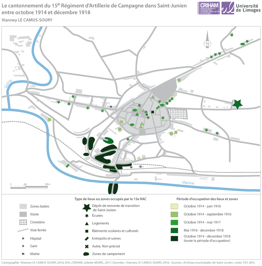 Carte 2 : Le cantonnement du 15e Régiment d'Artillerie de Campagne dans Saint-Junien entre octobre 1914 et décembre 1918