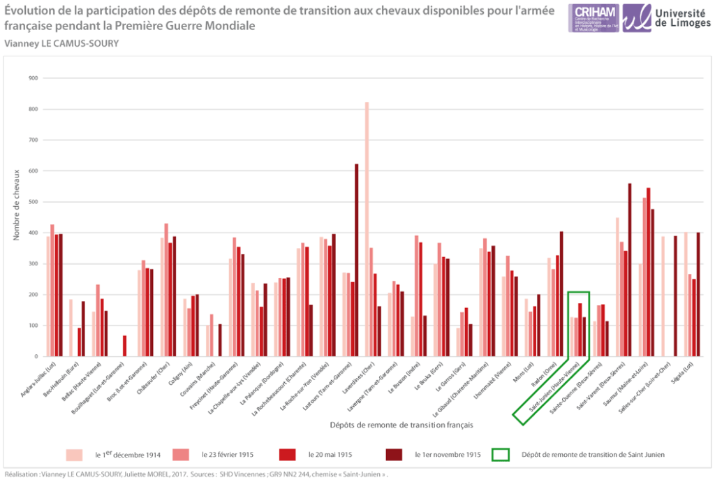 Un autre impact de la Grande Guerre dans Saint-Junien est l’installation du 15ème Régiment d’Artillerie de Campagne (R.A.C.), unité militaire du nord de la France réfugiée en Limousin. Les militaires occupent une grande partie de la ville, ce qui n’est pas sans conséquences pour les habitants, avec en outre l’occupation de tous les établissements scolaires et des incivilités de la part des soldats. Si cette cohabitation est difficile, elle l’est bien plus dans le cas du dépôt de remonte de transition, en raison de d’une brève occupation illégale entre la fin de l’année 1914 et le début de l’année suivante par le 15ème R.A.C. Cet incident souligne surtout les difficultés des artilleurs à trouver de bonnes conditions de vie, en particulier pour leurs chevaux vivant majoritairement dans des écuries peu salubres. Obtenir les bâtiments du dépôt de remonte de transition fut envisagé comme une solution efficace.