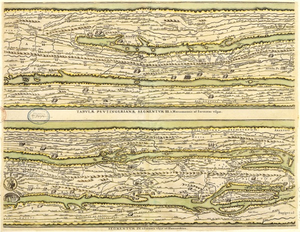 La production cartographique romaine est en grande partie liée à l’extension de l’Empire romain (30 avant J.-C. – 400 après J.-C.). En effet, si l’approche grecque était éminemment scientifique, l’approche romaine répond à des besoins pratiques. Le premier est militaire. Des topographes, les agrimensores, suivent les armées de conquêtes et réalisent des guides dont l’objectif est d’être une aide au voyage. Ce qui prime est l’itinéraire, le réseau de villes et de voies. Totalement déformée, la carte privilégie la ligne à l’espace. L’exemple le plus fameux en est la Table de Peutinger. La version originale de cette carte daterait des premières décennies de notre ère, mais elle ne nous est connue que par une copie du XIIIe siècle. Toutes les terres connues sont censées être représentées puisqu'elles sont bordées par la mer, mais elles se présentent de façon distendue au profit de la représentation des routes, des distances et des villes principales de l'Empire romain qui constituaient le cursus publicus.
