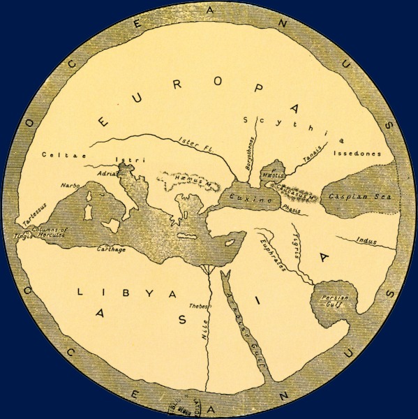 Alors que les cartes précédentes s’attachaient à une portion réduite de l’espace, les Grecs vont commencer à élaborer des systèmes de représentation du monde. On passe alors de l’arpentage au début de la projection cartographique. Si l’un mesure un terrain restreint et donc la représentation ne subit pas de déformation, l’autre a pour objectif de représenter l’intégralité du globe terrestre sur un support en deux dimensions et doit donc utiliser un « système » tenant compte de la rotondité de la Terre afin de transcrire sans déformation les distances et les angles en passant de la sphère à la feuille de papier. Cette évolution est tributaire des calculs de Thalès de Milet (624-547 avant J.-C.) qui pressent la notion de sphéricité de la terre. Quelques années plus tard, Anaximandre (610-546 avant J.-C.) réalisera une première carte du monde, centrée sur la Méditerranée, qu’Hécatée (550-480 avant J.-C.) complètera et affinera par la suite. Le monde connu ou Oekoumène est alors représenté comme un disque plat entouré par un océan. Il se compose de l'Europe, dont la partie nord est mal délimitée, de l'Asie qui s'arrête à l'Inde et à l'Oural méridional, et enfin de l'Afrique dont la partie sud est délimitée par le Sahara. La partie inconnue du monde est symbolisée par un continent incognita séparé de l’Oekoumène. Par ailleurs, Hécatée est l'auteur d'un traité Voyage autour du monde dont Hérodote (484-420 av. JC) s'est inspiré pour ses propres écrits. Ce sont les bases de la géographie qui sont alors posées.