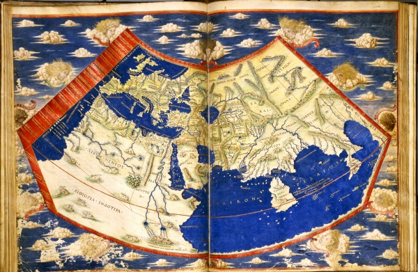La carte de l'Œcoumène, Géographie, Livres I-VIII, Ptolémée, Constantinople (?), Début du XVe siècle., Manuscrit sur parchemin, BnF, Manuscrits, Grec 1401 fo 50v-51, © Bibliothèque nationale de France