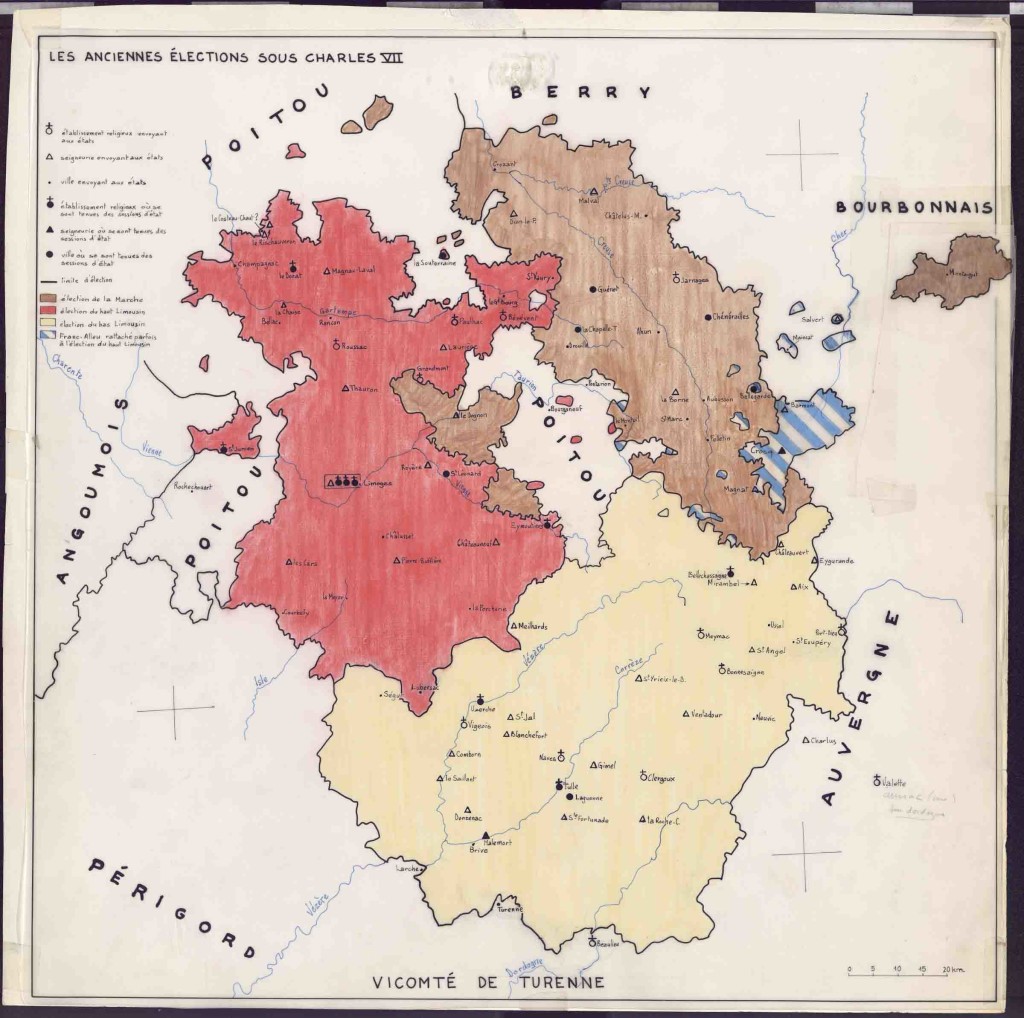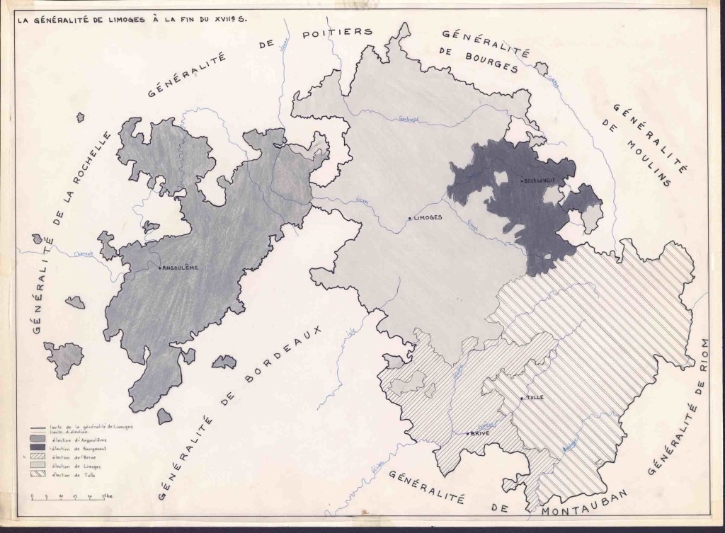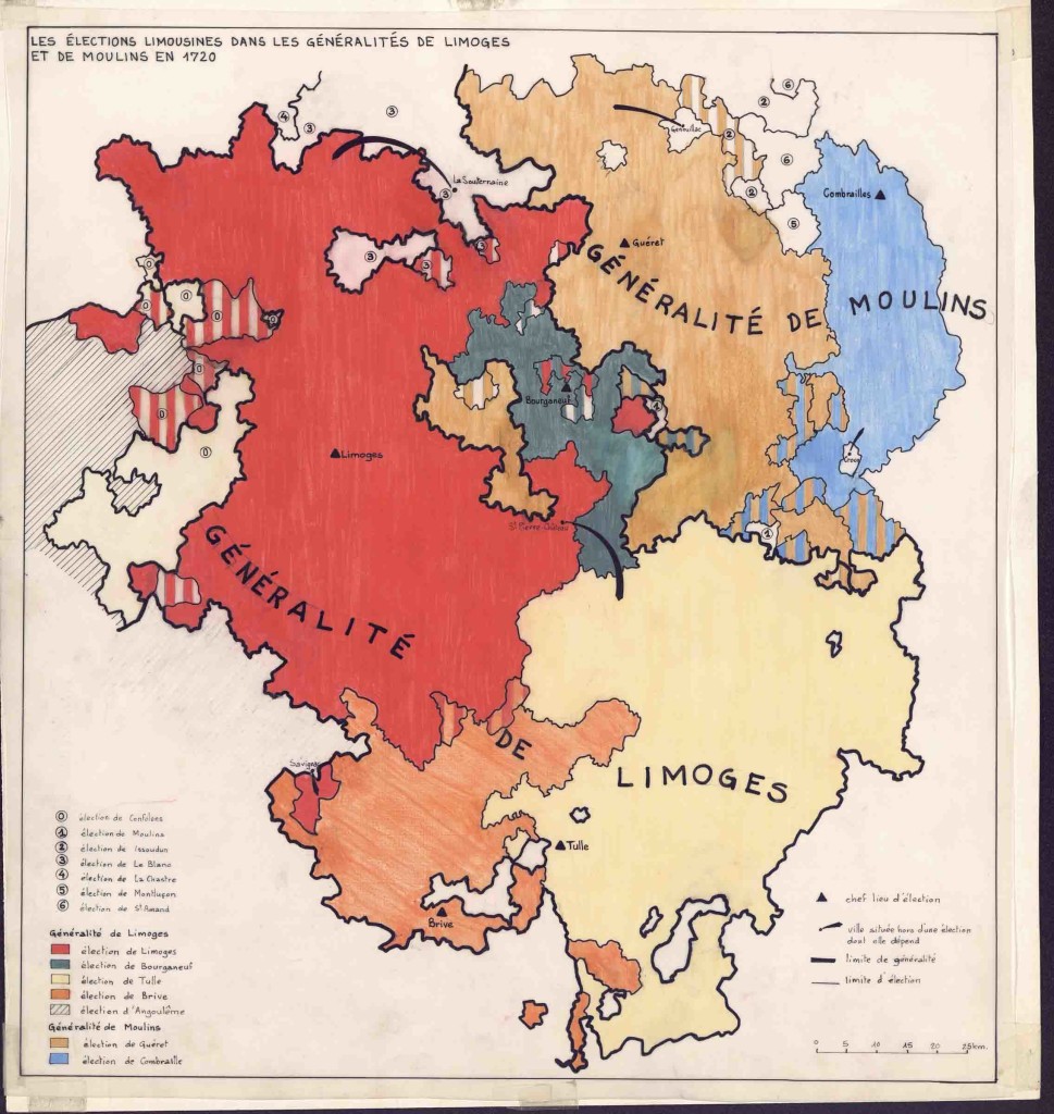 Les élections limousines dans les généralités de Limoges e. Atlas de Bautier (BFM)t de Moulins en 1720