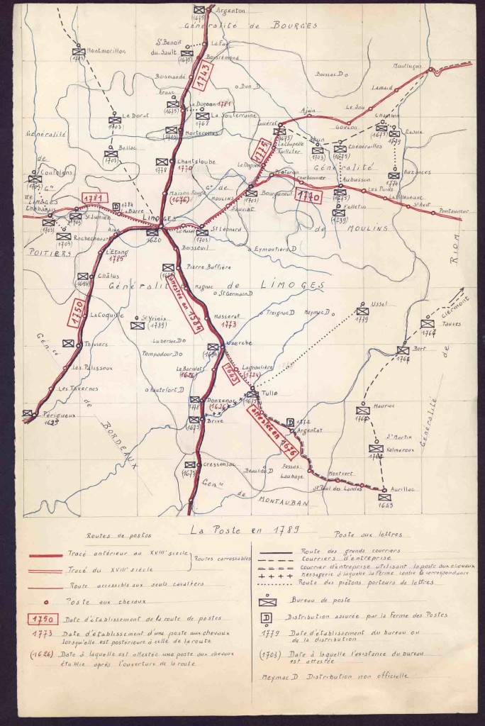 Etat des grandes routes et des voies de communications dans la généralité de Limoges en décembre 1787. Atlas de Bautier (BFM)