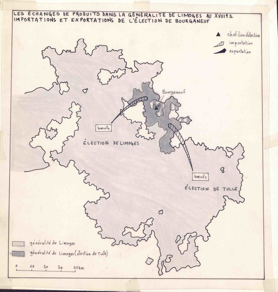 Les échanges de produits dans la généralité de Limoges au XVIIIe s. Importations et exportations de l'élection de Bourganeuf. Atlas de Bautier (BFM)