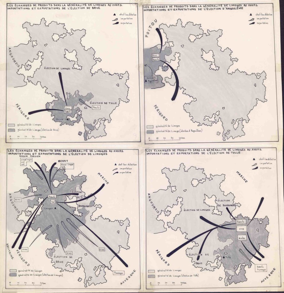 Les échanges de produits dans la généralité de Limoges au XVIIIe s. Importations et exportations de l'élection de Brive / Importations et exportations dans l'élection d'Angoulême / Importations et exportations dans l'élection de Limoges / Importations et exportations dans l'élection de Tulle. Atlas de Bautier (BFM)