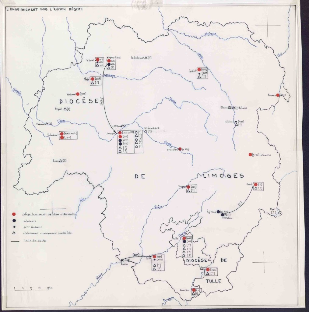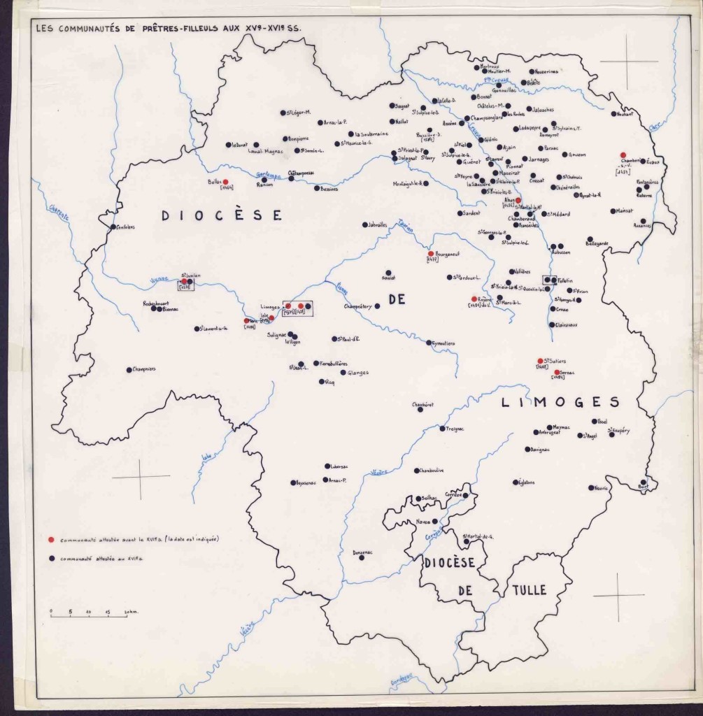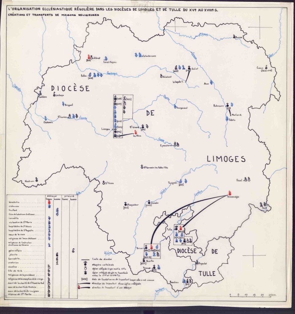 L'organisation ecclésiastique régulière dans les diocèses de Limoges et de Tulle du Xve au XVIIIe s. Création et transferts de maisons religieuses. Atlas de Bautier (BFM).