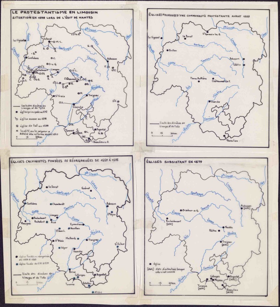 Le protestantisme en Limousin. Situation en 1598 lors de l'édit de Nantes / Eglises pourvues d'une communauté protestante avant 1559 / Eglises calvinistes fondées ou réorganisées de 1559 à 1598 / Eglises subsistant en 1679. Atlas de Bautier (BFM).