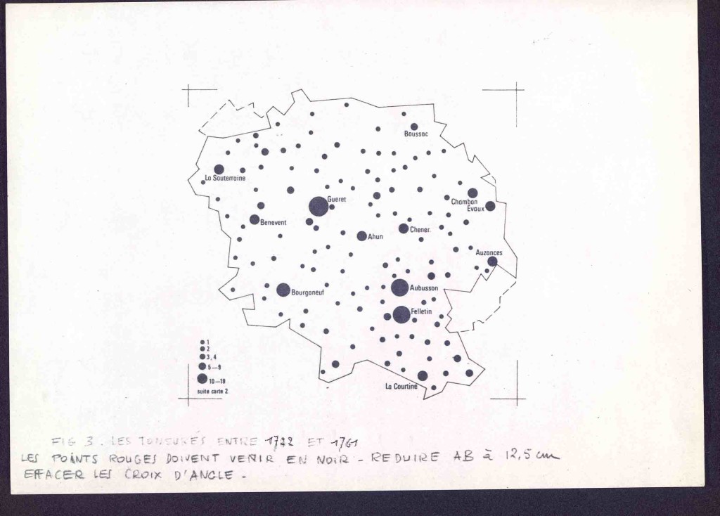 Les tonsurés entre 1722 et 1761, Creuse. Atlas de Bautier (BFM).