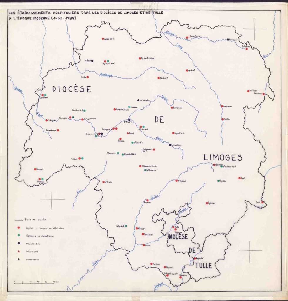 Les établissements hospitaliers dans les diocèses de Limoges et de Tulle à l'époque moderne (1452-1789). Atlas de Bautier (BFM).