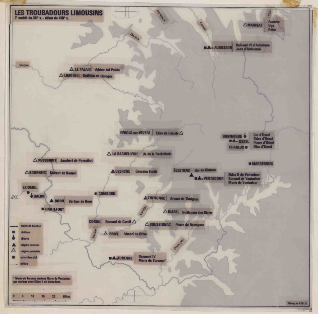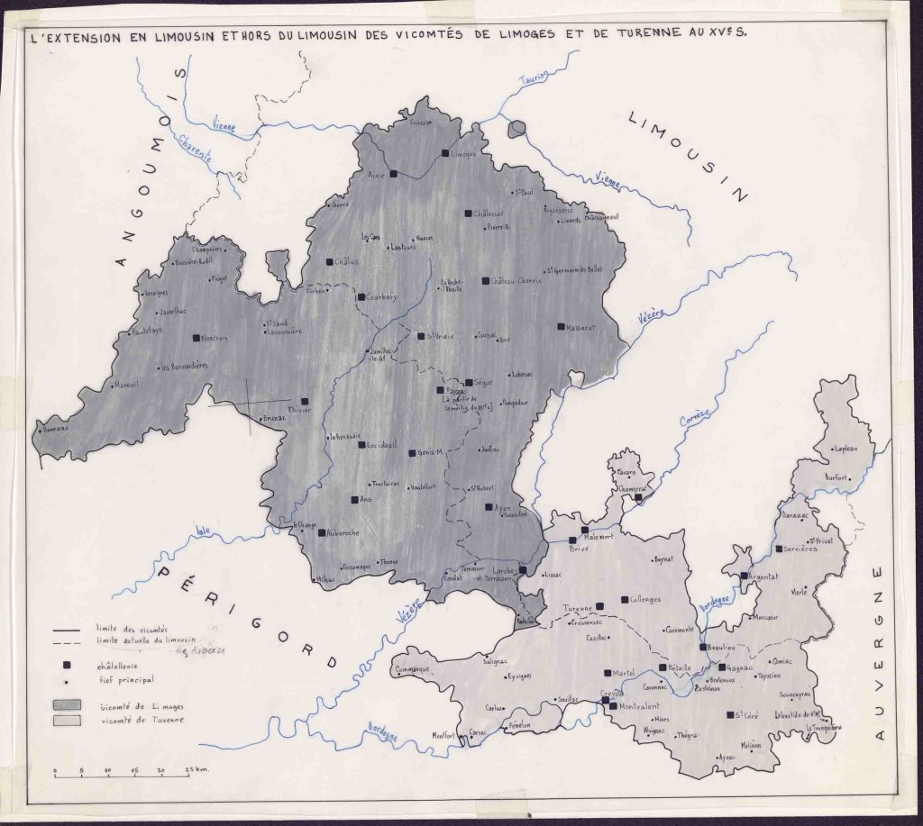 - Au IXe siècle, le comte de Poitou délègue localement le pouvoir au vicomte de Limoges. Au Xe siècle, ce pouvoir s’émiette, apparaît ce qui deviendra le comté de la Marche puis au XIe, quatre nouvelles vicomtés émergent, Comborn, Aubusson, Ventadour, Turenne tandis que la vicomté de Limoges s’étend désormais sur la partie occidentale du Limousin, débordant largement en Périgord.