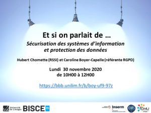 Hubert Chomette, RSSI, et Caroline Boyer-Capelle, référente RGPD de l’Université de Limoges feront une présentation pour nous sensibiliser et nous proposer des solutions concernant la sécurité des systèmes de l’information et la protection des données, le lundi 30 novembre de 10H à12H00, par visio sur  la plateforme BigBlueButton :   https://bbb.unilim.fr/b/boy-uf9-97z
