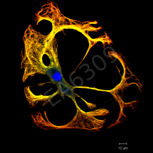 Bleu : le noyau / Rouge : la « glial fibrillary acidic protein » (GFAP) / Vert : la vimentine