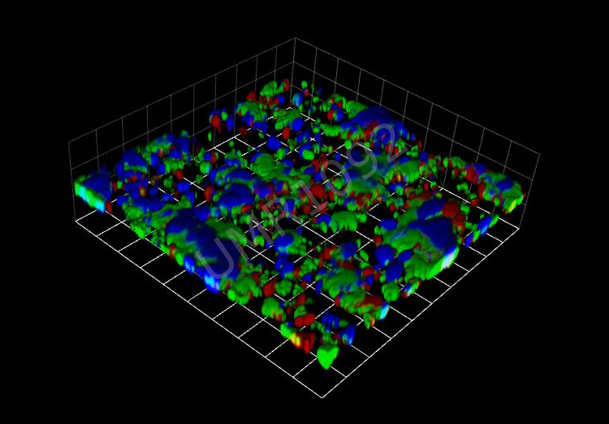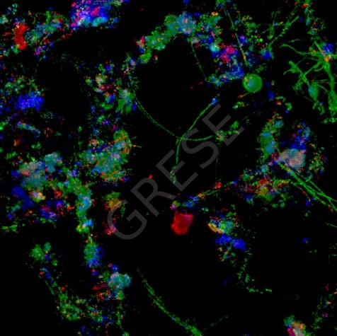 Vert : bactéries vivantes / Rouge : bactéries mortes / Bleu : autofluorescence