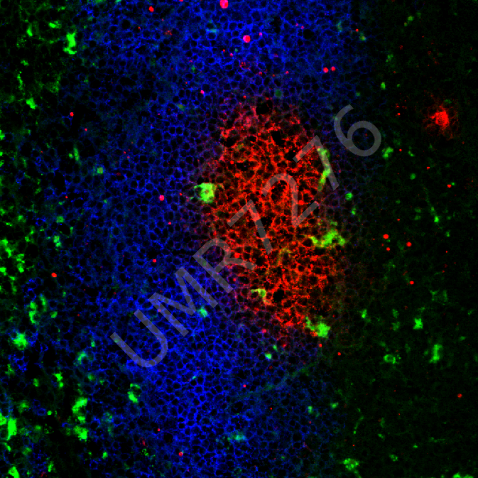 Bleu : cellules B / Rouge : zone folliculaire / Jaune : centres germinatifs /