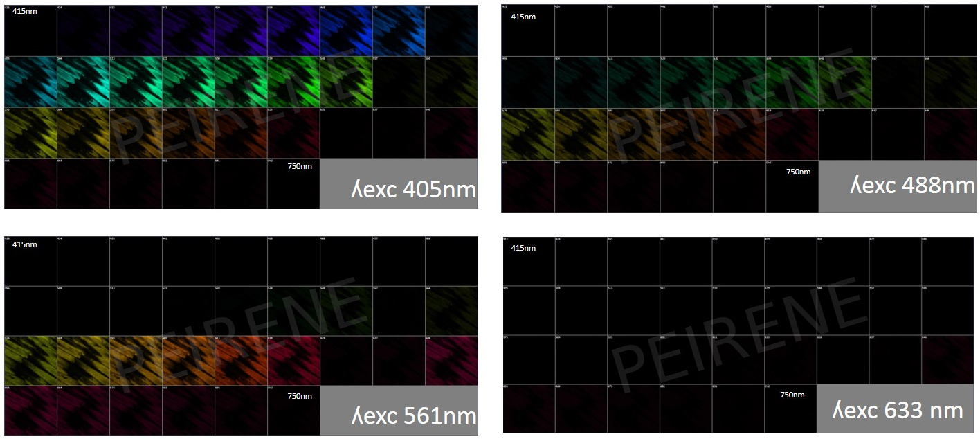 Fluorescence émise entre 405nm et 700nm après excitation à 405nm, 488nm, 561nm et 633nm.