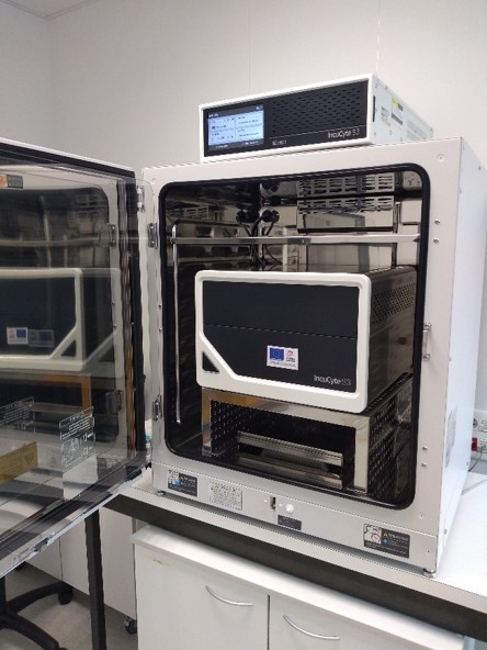 • Microscope inversé motorisé en x,y placé dans un incubateur