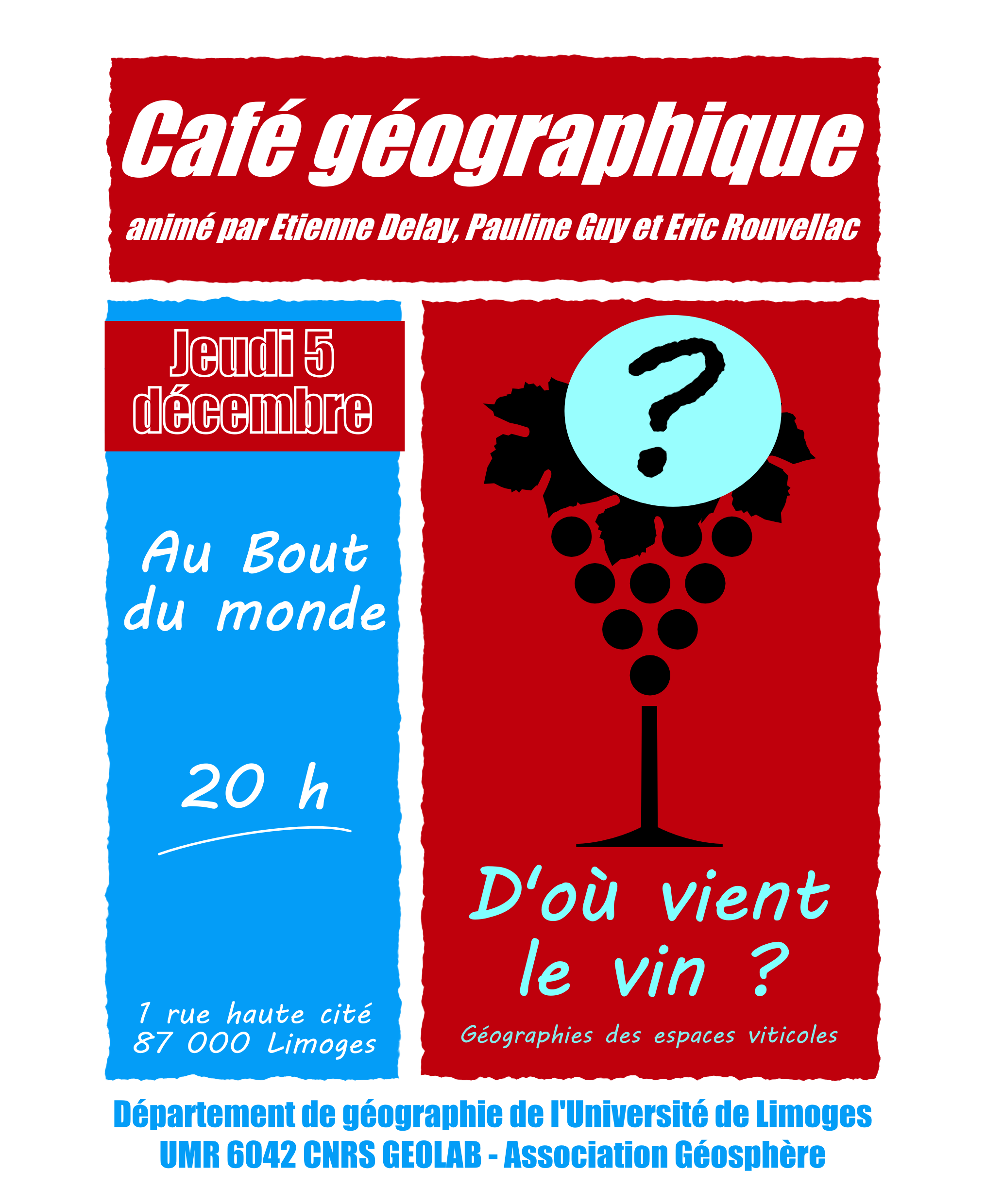On le déguste, on l’apprécie, mais d’où vient le vin ? C’est à cette question, simple en apparence, que tenteront de répondre des chercheurs en géographie de l’Université de Limoges. A travers leurs expériences et leurs connaissances de différents vignobles à travers le monde, ils viendront faire partager un regard curieux et décalé sur les enjeux des territoires de production viticole. Venez donc participer à ce voyage qui vous mènera de Banyuls au Bordelais en passant par le Trentin Haut-Adige (Italie) l’Afrique du Sud et le Chili ! Ce premier café géographique de la saison 2013/2014 a eu lieu le jeudi 5 décembre 2013 à partir de 20h, Au Bout du Monde, rue haute cité à Limoges.