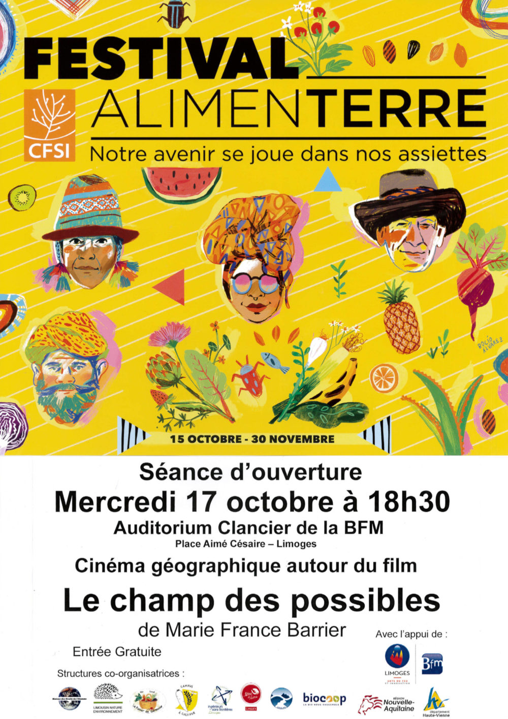 Structures organisatrices : Campus à Cultiver – Ingénieurs Sans Frontières – Le Panier de Germaine – Limousin Nature Environnement – Maison des Droits de l’Homme – Terre de Liens Limousin – Université de Limoges (Géolab) en partenariat avec la BFM.