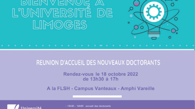 La réunion d’accueil des nouveaux entrants en Doctorat de l’Université de Limoges se tiendra en présentiel le Mardi 18 Octobre 2022 de 13h30 à 17h, à la Faculté des Lettres et Sciences Humaines, Campus Vanteaux, dans l’AMPHI VAREILLE.
