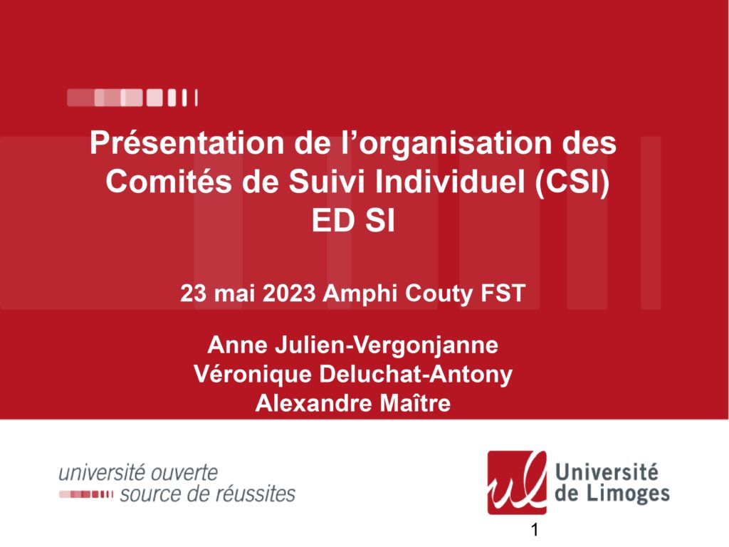 Le CSI veille au bon déroulement du cursus en s’appuyant sur la Charte du Doctorat de l’Université de Limoges et la Convention Individuelle de Formation (CIF) qui précise notamment les modalités d’encadrement, de suivi de la formation et d’avancement des recherches du doctorant.