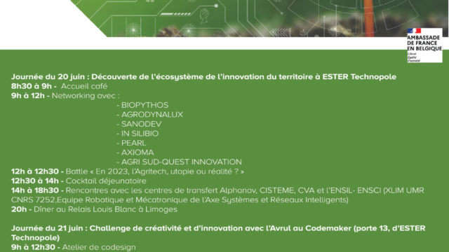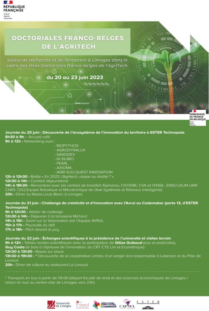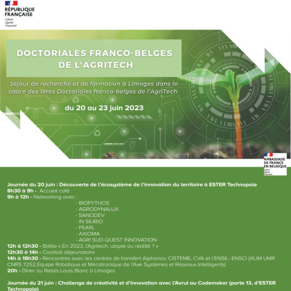 Catégories : Actualités / International / Recherche Doctoriales Franco-Belges de l’AgriTech Doctoriales Franco-Belges de l’AgriTech 20 au 23 juin 2023 9 h à 20 h ESTER Technopole (1 Avenue d’Ester, 87069 Limoges) Le Pôle International de l’Université de Limoges et CAP’sUL, en partenariat avec Ester Technopole organisent des Doctoriales franco-belges : 33 rue François Mitterrand BP 23204 87032 Limoges - France Tél. +33 (5) 05 55 14 91 00 université ouverte source de réussites