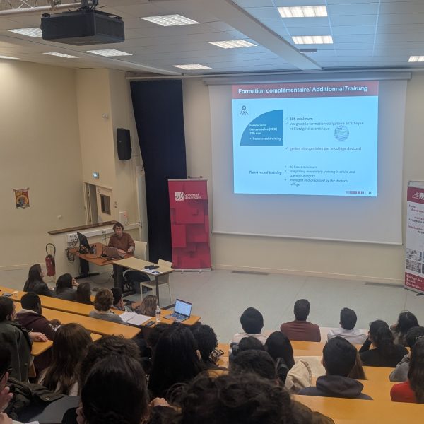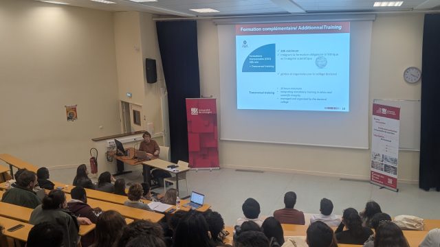 Mme Anne JULIEN VERGONJEANNE, la directrice de l’École Doctorale Sciences et Ingénierie à présenter le fonctionnement de l’ED lors de la réunion d’accueil des doctorants primo-entrants du jeudi 6 novembre 2025.