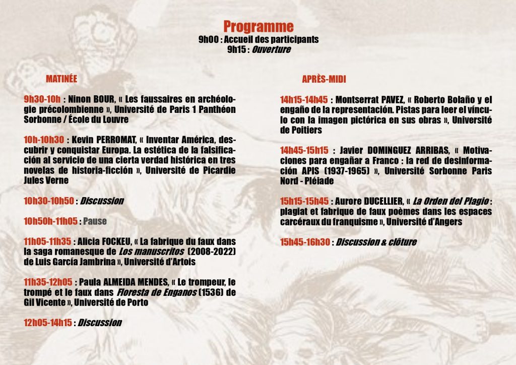 Moi qui falsifie, qui suis-je, pourquoi dénaturé-je, comment contrefais-je ? Les réponses à ces trois questions pourront recouvrir les champs de la littérature, des arts, de la linguistique, de l’histoire et de la civilisation des ères hispaniques.