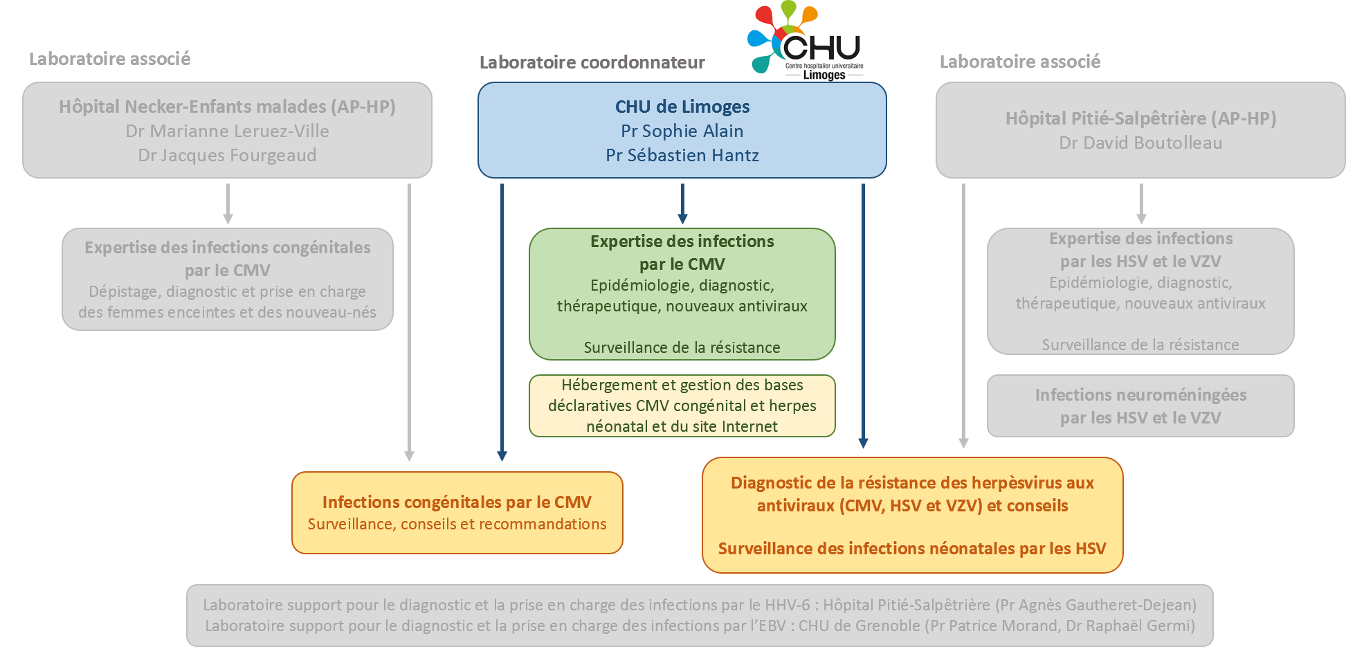 Le CNR HerpèsvirusNos équipesLaboratoire coordonnateur: CHU Limoges Laboratoire coordonnateur: CHU Limoges Professeur Sophie ALAIN Directrice du CNR Herpèsvirus Médecin Biologiste du service de Bactériologie / Virologie / Hygiène du CHU de Limoges tel : 05 55 05 67 28 Courriel : *protected email* Professeur Sébastien HANTZ Directeur adjoint du CNR Herpèsvirus Médecin Biologiste du service de Bactériologie / Virologie / Hygiène du CHU de Limoges tel : 05 55 05 86 42 Courriel : *protected email* Mélissa MAYERAS Ingénieur du CNR Herpèsvirus Tel: 05 55 05 21 40 Courriel: *protected email* Fatoumata CONDET Technicienne du CNR Herpèsvirus Tel: 05 55 05 21 40 Courriel: *protected email* Valentin TILLOY Ingénieur du CNR Herpèsvirus Tel: 05 19 76 17 19 Courriel: *protected email* Françoise GARNIER Ingénieur du CNR Herpèsvirus Tel: 05 55 05 6726 Courriel: francoise.*protected email* Elodie RIBOT Ingénieur du CNR Herpèsvirus Tel: 05 55 05 69 71 Courriel: *protected email*