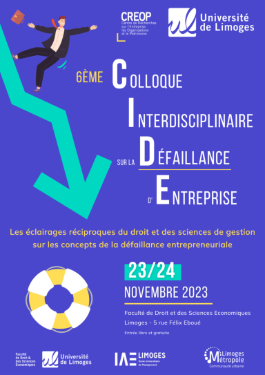 Le CREOP, laboratoire bi-disciplinaire Droit et Gestion de l’Université de Limoges, organise, les 23 et 24 Novembre 2023, la sixième édition du colloque interdisciplinaire sur la défaillance d’entreprise ( CIDE) autour des éclairages réciproques du droit et des sciences de gestion sur les concepts de la défaillance entrepreneuriale. L’ambition de ce colloque est d’apporter un regard croisé droit gestion tant sur la situation de l’entreprise que sur des éléments tenant au contexte économique et à l’écosystème entrepreneurial et menant à une situation de défaillance. Une session plénière (assurée par Maître Hèlène Bourbouloux, Administratrice judiciaire) et une table ronde (animée par Pr. Régis Blazy, Université de Strasbourg ; Pr. Véronique Bourgninaud, Université de Lille et Pr. Nicolae Stef, Université Burgundy School) seront organisées en amont des sessions parallèles.