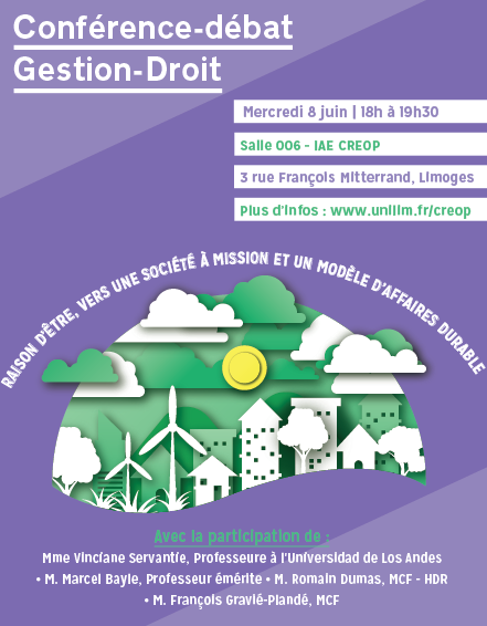Dans le cadre de la venue du professeur Vinciane Servantie, Université de Los Andes, Bogota, Colombie, le CREOP organise une conférence bi-disciplinaire Droit-gestion « Raison d’être vers une société à mission et un modèle d’affaires durables » avec la participation du professeur Marcel Bayle, de Romain Dumas et François Gravié-Plandé, MCF. La conférence contribue à la 2e édition du Mois de la recherche IAE France : https://www.iae-france.fr/juin-2022-rdv-pour-la-2eme-edition-du-mois-de-la-recherche-iae-france/
