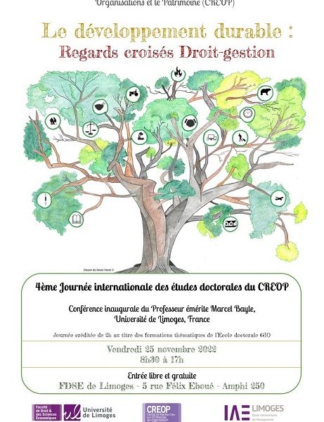 Le vendredi 25 novembre 2022 au sein de la Faculté de Droit et des Sciences Économiques de Limoges (Amphi 250) à partir de 8h30 jusqu’à 17h00, le CREOP organise une journée autour de regards croisés Droit & Gestion sur le thème du développement durable. Cette journée sera organisée en plusieurs temps avec notamment une conférence inaugurale du Professeur Emérite Marcel Bayle, une table ronde sur la question de la soutenabilité d’un développement durable ainsi que neuf communications de jeunes chercheurs en Droit et Sciences de Gestion en relation avec cette question.