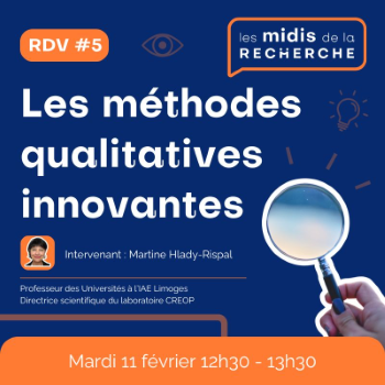 La prochaine session des « Midis de la Recherche » se tiendra le mardi 11 février, de 12h30 à 13h30. Cette session, animée par Benjamin Adam, sera dédiée aux méthodes qualitatives innovantes. Pour nous en parler, nous recevrons Martine Hlady-Rispal, Professeur des Universités à IAE Limoges, qui a notamment écrit un ouvrage phare sur la méthode des cas en sciences de gestion (disponible ici) et qui est la directrice scientifique du CREOP.