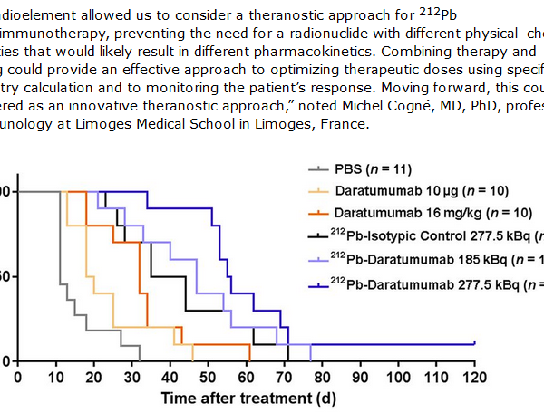 Compte tenu de la demi-vie, de la production et de la distribution mondiale de 212Pb-anti-CD38, l’α-radioimmunothérapie serait non seulement efficace, mais aussi cliniquement faisable comme traitement du myélome multiple.