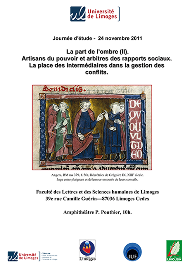 Cette journée s’inscrit dans un cycle débuté en 2010 par l’organisation d’une première journée d’étude à l’Université de Limoges sur un thème similaire. A cette occasion, les intervenants ont mis en valeur dans une grande variété de milieux (laïc, ecclésiastique, diplomatique, judiciaire et municipal) des pratiques de gouvernement et d’administration exercées par des hommes placés en retrait de la scène institutionnelle ; timidement révélée par les sources, leur action est finalement déterminante.