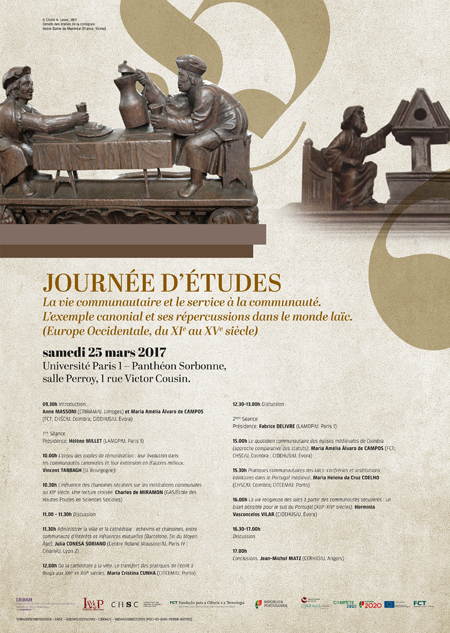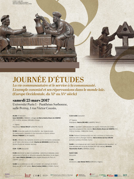 Cette Journée d’études s’intègre dan sle projet de recherche post-doctorale financé par la Fondation Portugaise pour la Science et la Technologie (SFRH/BPD/100765/2014). Cette réunion entre dans les projets du CHSC – UID/HIS/00311/2013 et du CIDEHUS – UID/HIS/0057/2013 et est cofinancée par les fonds européens FEDER/COMPETE 2020 (POCI-01-0145-FED-ER-007702). Elle est appuyée par le Centre de Recherches Interdisciplinaires en Histoire, Histoire de l’Art et Musicologie – EA 4270 CRIHAM – Université de Limoges et le Laboratoire de Médiéviste Occidentale de Paris – UMR 8589 – CNRS – Université de Paris I.