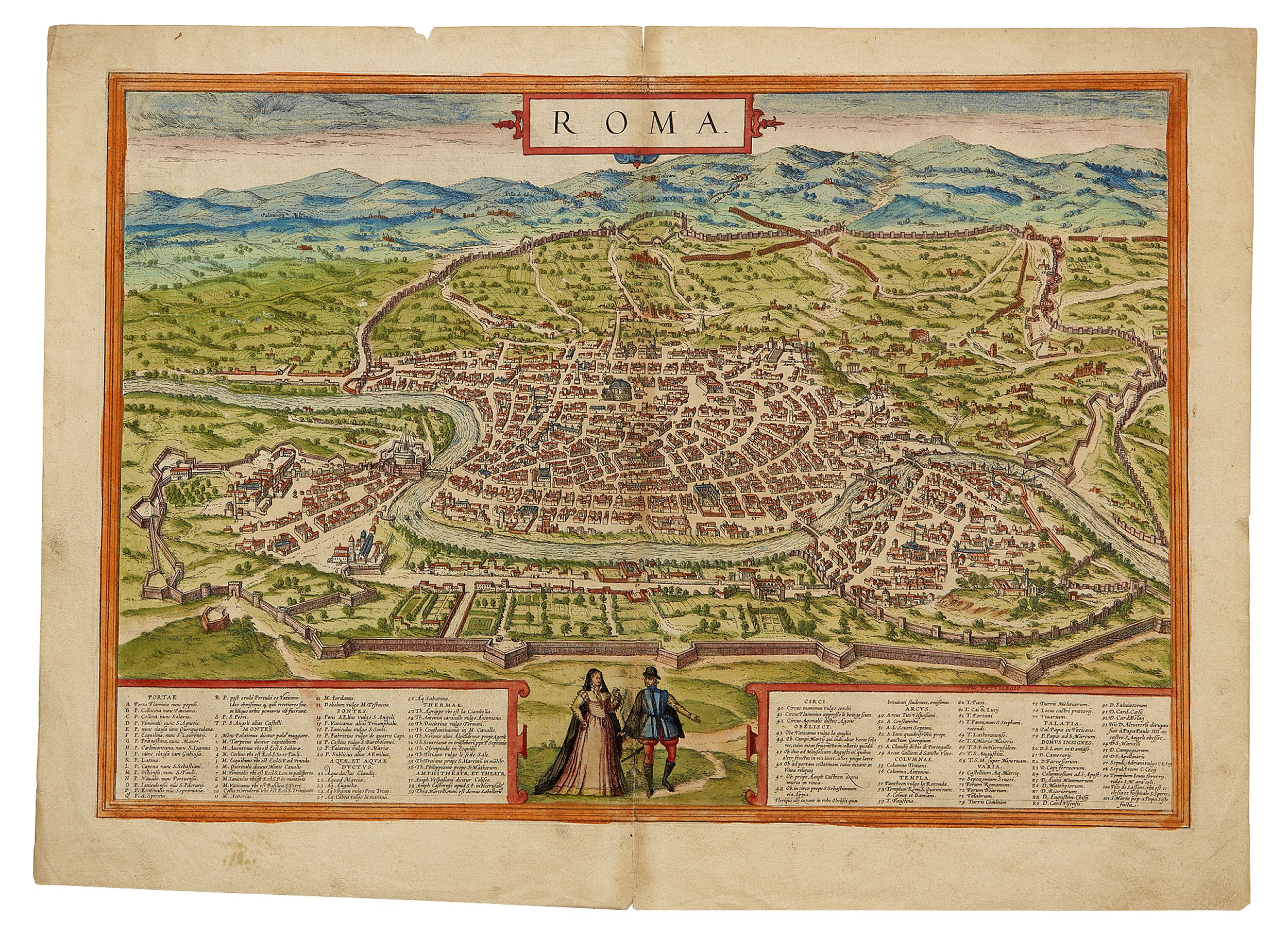 Légende de l’illustration jointe : « Roma », Plan de Rome. Extrait des Civitates Orbis Terrarum de Frans Hogenberg et Georg Braun. Cologne, 1572-1618. Collection électronique de l’Universiteitsbibliotheek Utrecht.