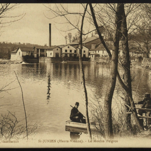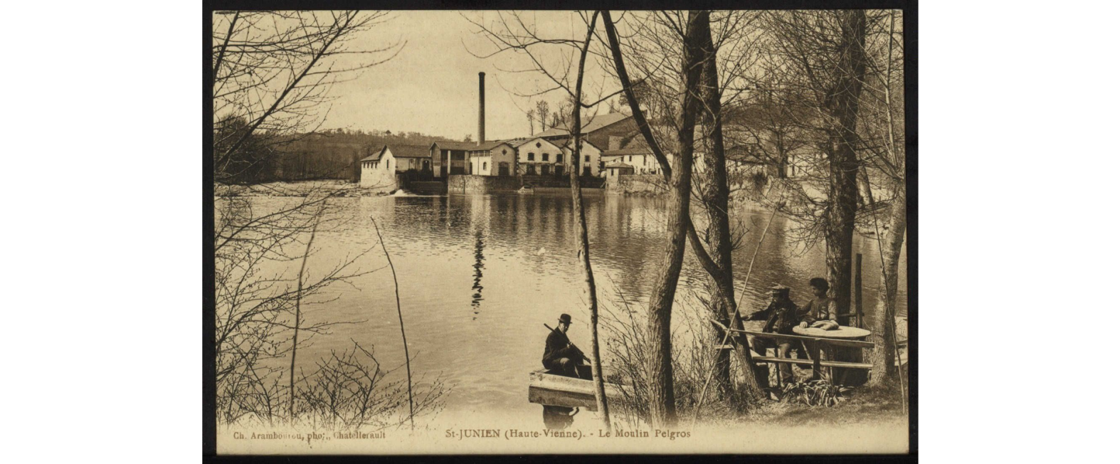 Légende photo : Usine à papier du moulin Pelgros à Saint-Junien en Haute-Vienne autour de 1900 (46Fi22)