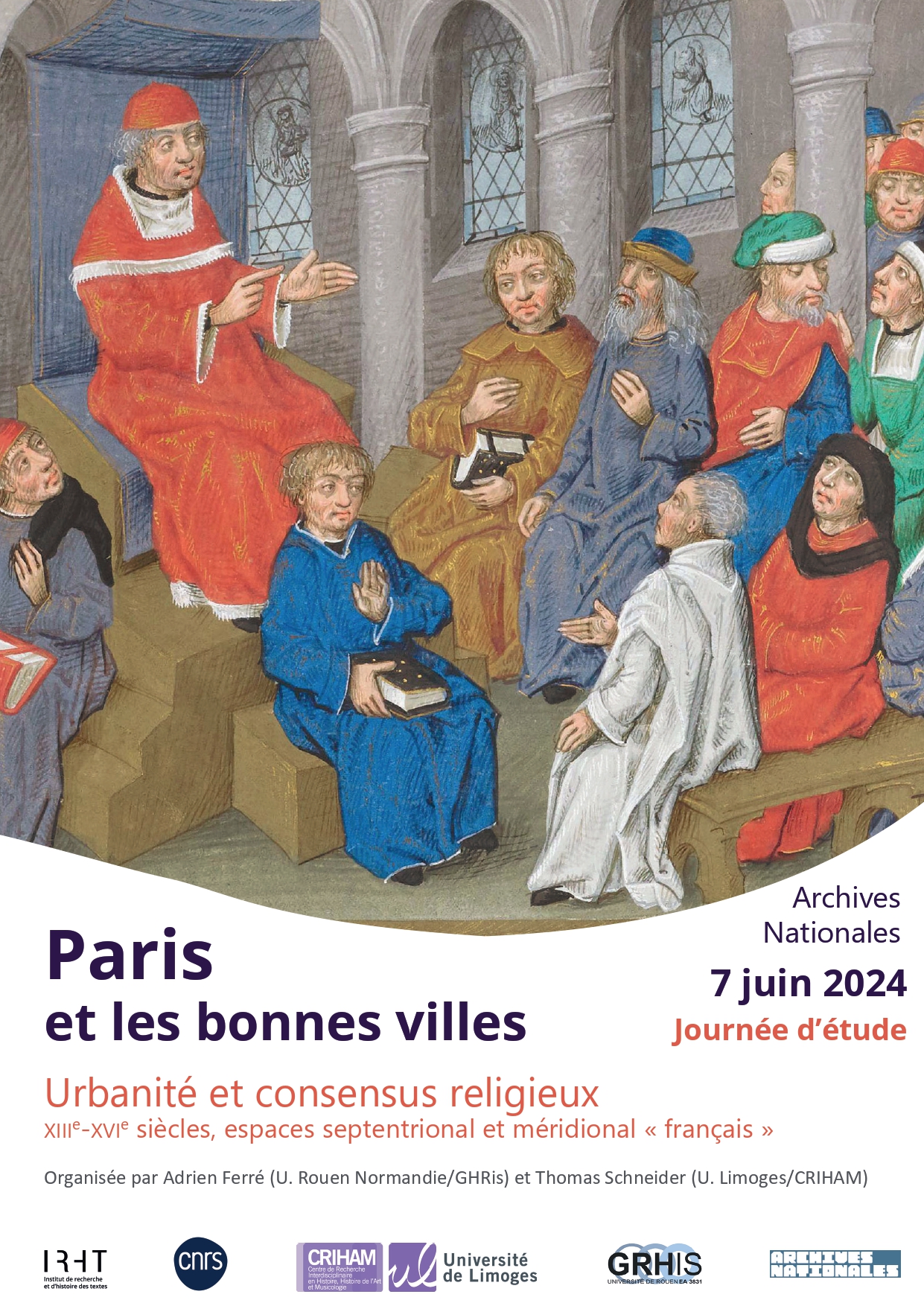 Du nord au sud du royaume de France, compris dans ses limites élargies de la fin du Moyen Âge, le fait religieux est un des facteurs retenus pour questionner la construction de l’identité des villes, qu’elles soient ou non sous domination capétienne. Une 1ère journée d’étude, tenue le 16 juin 2023, a permis de réinterroger l’urbanité dans les « bonnes villes », concept défini il y a quarante ans par Bernard Chevalier et plus récemment repris par Hélène Noizet. Plus qu’à ce concept, dont Cléo Rager a mis en évidence les hésitations de l’historiographie récente face à cette modélisation, c’est avant tout aux « bonnes gens » ou plus simplement aux élites urbaines de la « ville en prière » que nous nous proposons de consacrer une deuxième journée sous l’angle de leurs « pratiques festives et religieuses particulières ». Par « bonnes gens », on comprendra ici non seulement les laïcs, mais aussi la part que leurs familles consacrent aux clercs, notamment aux chanoines des chapitres cathédraux ou collégiaux, fils et frères des premiers, tant il est vrai que les deux sphères interagissent dans une porosité fructueuse au service d’une même affirmation sociale.