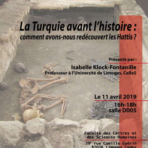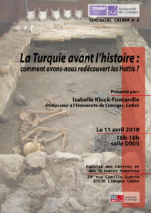 Catégories : Séminaire CRIHAM Séminaire CRIHAM 8 Détails Début: 11 avril 2019, 16 h 00 min Lieu: Faculté des Lettres et Sciences Humaines Catégories: Séminaire CRIHAM Présentation La Turquie avant l’histoire : comment avons-nous redécouvert les Hattis ? Présenté par : Isabelle Klock-Fontanille Professeur à l’Université de Limoges, CeReS Plan