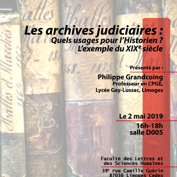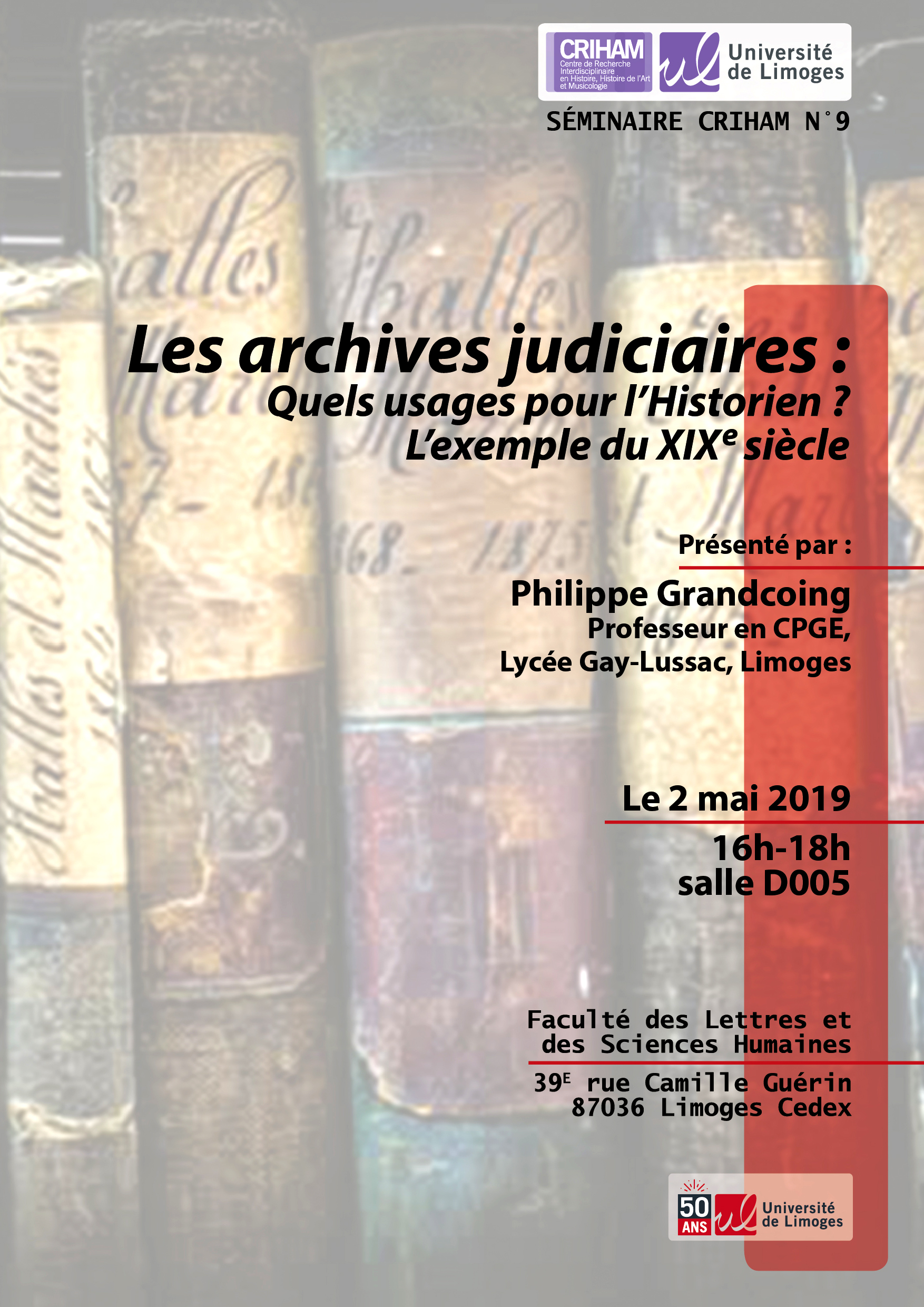Catégories : Séminaire CRIHAM Séminaire CRIHAM 9 Détails Début: 2 mai 2019, 16 h 00 min Lieu: Faculté des Lettres et Sciences Humaines Catégories: Séminaire CRIHAM Présentation Les archives judiciaires : quels usages pour l’historien ? L’exemple du XIXe siècle Présenté par : Philippe Grancoing Professeur en CPGE Lycée Gay-Lussac Plan
