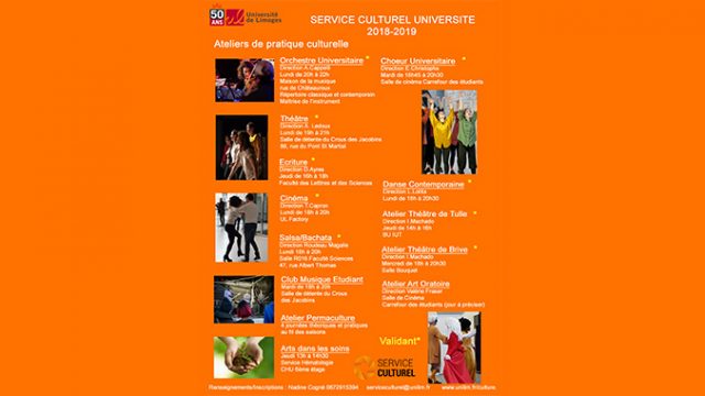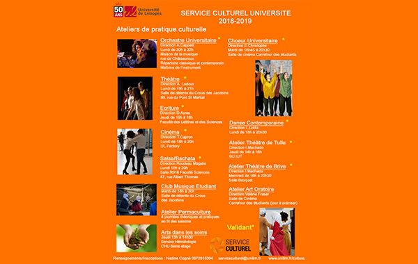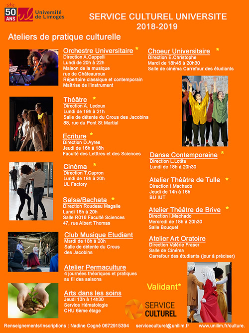 Catégories : Atelier ATELIERS DE PRATIQUE CULTURELLE ATELIERS DE PRATIQUE CULTURELLE Inscriptions/Réservations Service Culturel Université 88 rue du Pont Saint Martial 87000 Limoges Tél. +33 (5) 05 55 14 92 53 université ouverte source de réussites