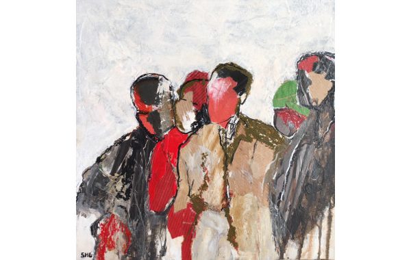 Pour l’exposition « Rencontres », l’artiste a choisi de présenter des portraits. L’inspiration lui est venue tout naturellement, en observant des étudiants, ses voisins, dont les gestes, les mouvements et les attitudes sont devenues ces visages et ces corps que les couleurs rendent présents au monde. Et si les yeux sont absents des visages, les corps, eux deviennent ces regards que Sophie Helme-Guizon pose sur l’autre. Les silhouettes sont emplies de couleurs brouillées, comme l’expression ultime de l’indéfini.