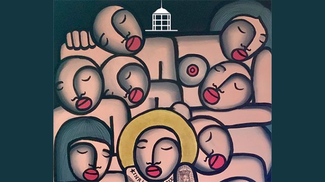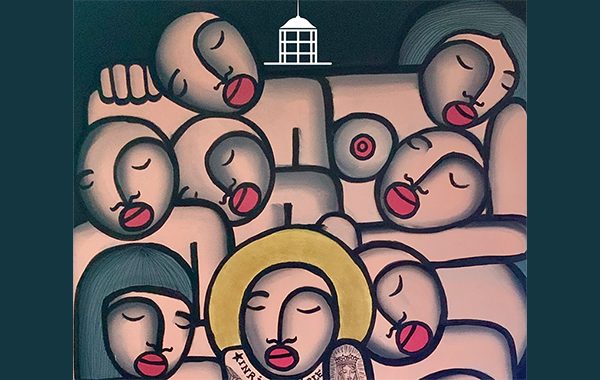 Yeux clos, bouche cousue, masque de lune cerné de nuit, ses personnages sont sa signature. Ce qui turbine sous les paupières collées, ce que ces lèvres charnues dégustent se devinent dans les mots et formules qui accompagnent l’œuvre en écho. Les sourires ne sont jamais loin des engagements, les regrets des emportements.