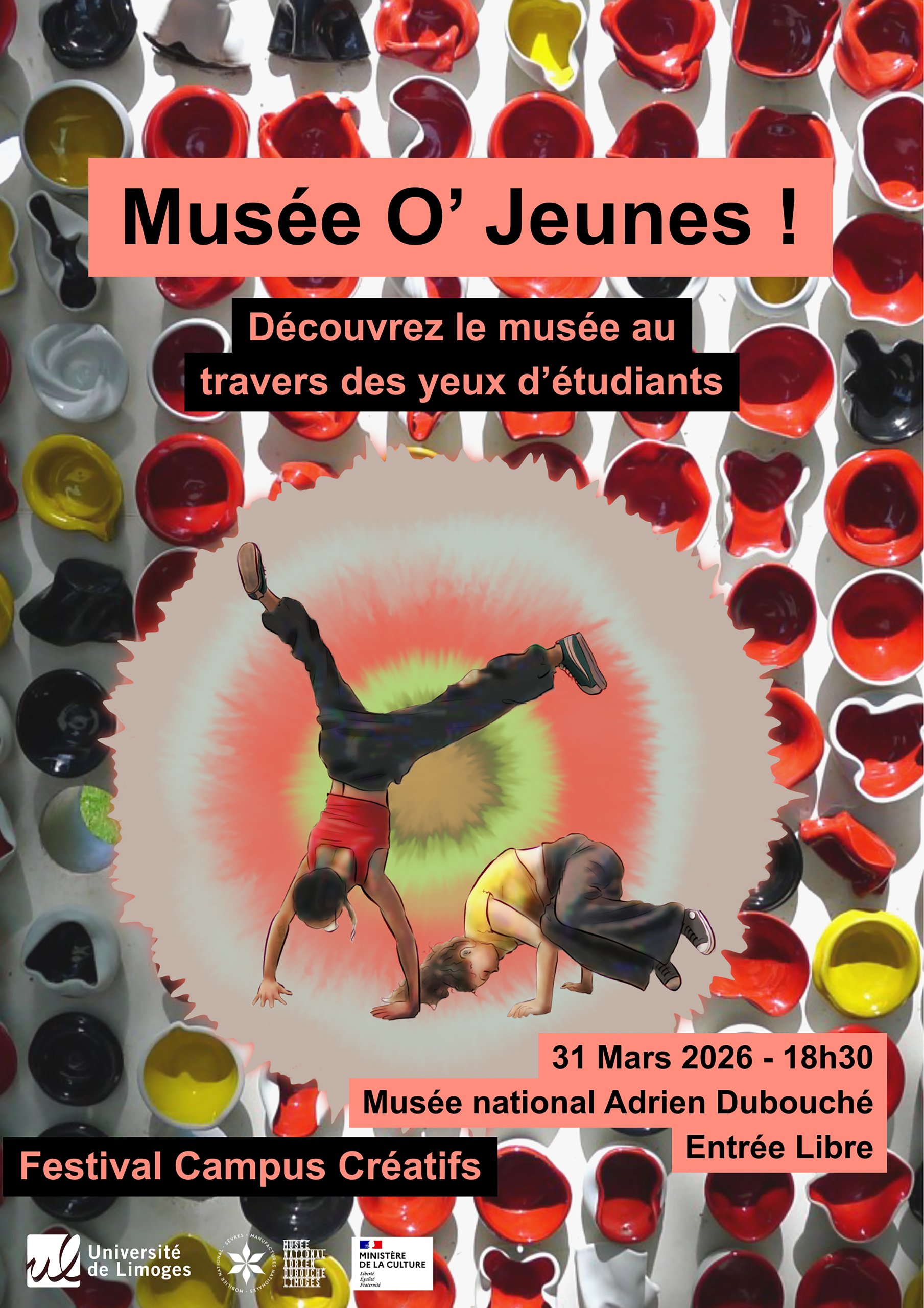 « Au beau milieu des œuvres du Musée national Adrien Dubouché, quelques étudiants des ateliers culturels ont choisi leur préférée… et en ont tiré de quoi alimenter leur propre art. Ce soir, découvrez ces créations au travers de leurs yeux. Vous découvrirez comment l’art se partage sans se soucier du temps et comment la jeunesse peut porter un nouveau jour sur le passé le temps de cette exposition temporaire. »